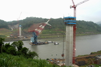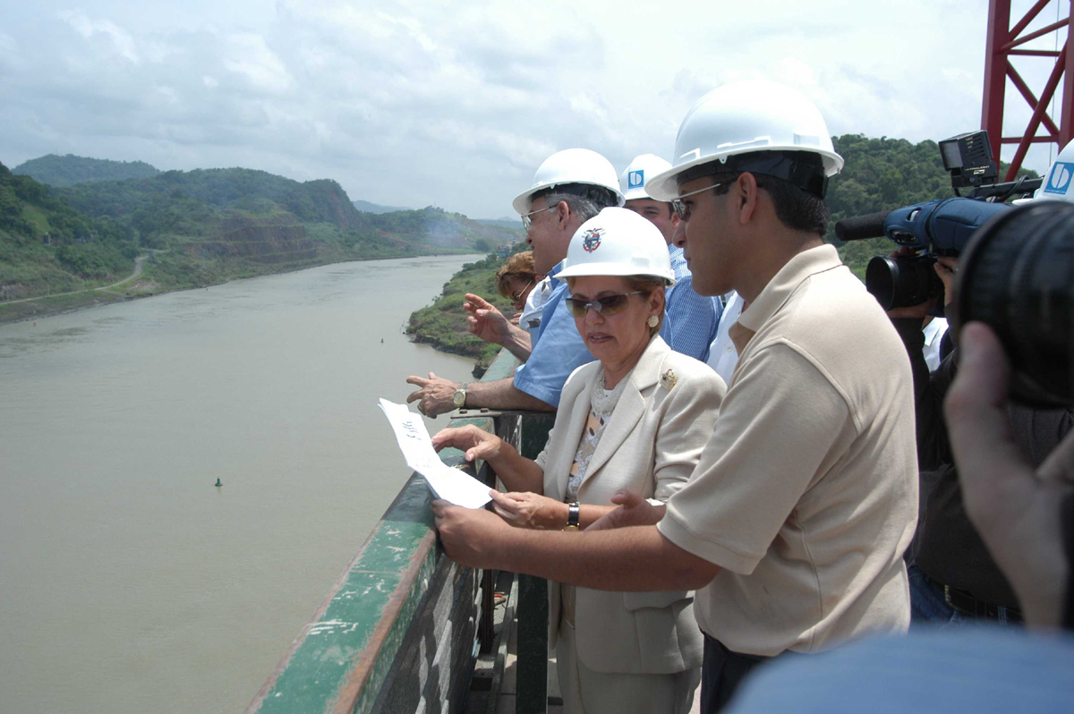 The second bridge will also help to reduce traffic congestion and improve safety in Panama City Benefits will accrue from time and vehicle operating cost savings. The project will also help to reduce emissions and noise levels. The new bridge was designed by a joint venture between TY Lin International and the Louis Berger Group Inc, for which the consortium was awarded $2.8 million. Bilfinger Berger AG (Germany), working with Australian subsidiary Baulderstone Hornibrook, were the building contractors and completed the project in just 27 months. But the second bridge over the Panama Canal won’t be finished complete as planned before Mireya Moscoso leaves office at the end of August for traffic (the bridge isn’t connected to any roads as yet and won’t be for some time.) So, instead of the usual inauguration ceremony for a public work, Mireya held a July 5 “pre-inauguration ceremony” in which she left her hand prints in the cement of the bridge’s surface and posed for photos with construction workers and executives.